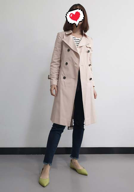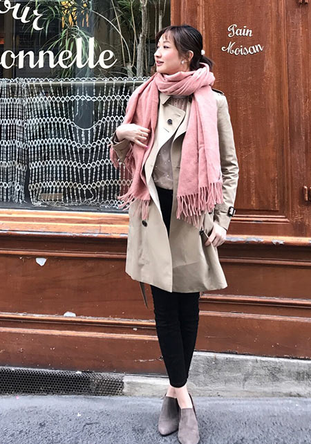 〈右コーデ〉フェミニンな着こなしにマッチする、ありそうでなかったスモーキーなピンク。思い切って袖をたくし上げたり、ボタン留めずにウエストマークする着こなしで、ピンクのトレンチがドラマなムードを引き立てます。