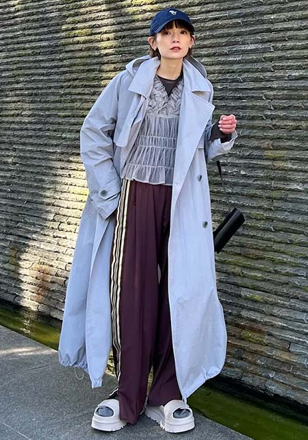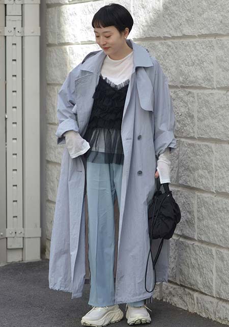 少しオーバーサイズ感でメンズのようなシックなオーラを醸し出しながら、フェミニンさを手元で主張するトレンチ。袖は絞らずに表情を変えて楽しむことも。