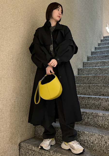 〈コーデ〉クラシカルなオール黒のコンサバコーデも、今らしいトレンチが一枚あれば雰囲気一新。太めの袖をひと折りし、細い手首を強調するテクニックも真似したいところ。