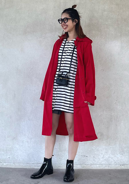〈右下コーデ〉かっこいいけど生真面目な着こなしにも見えがちなトレンチは、そでをまくりボタンを開け、ラフにくずして赤のもつ女らしさを最大限に引き上げて。
