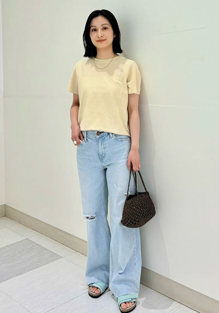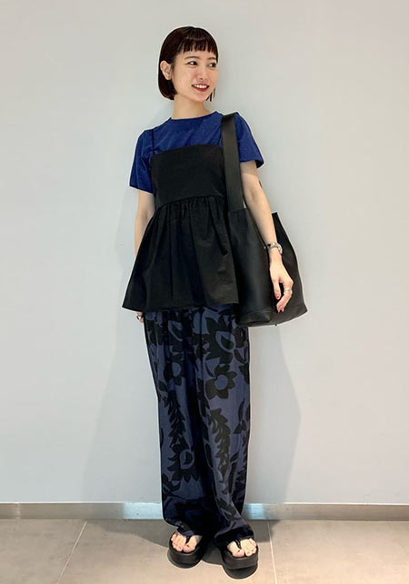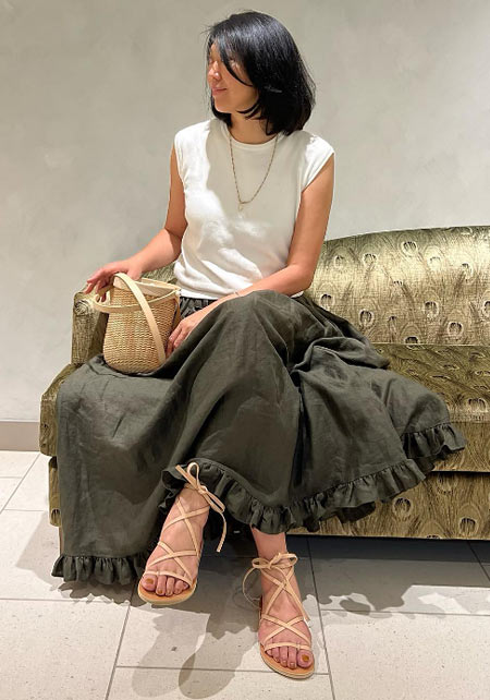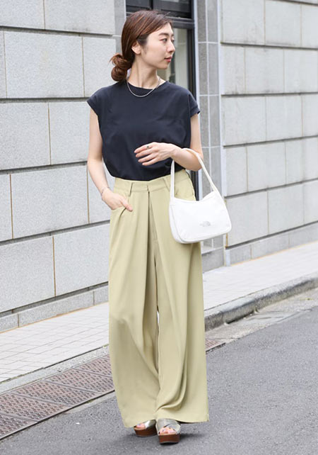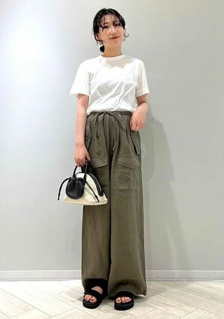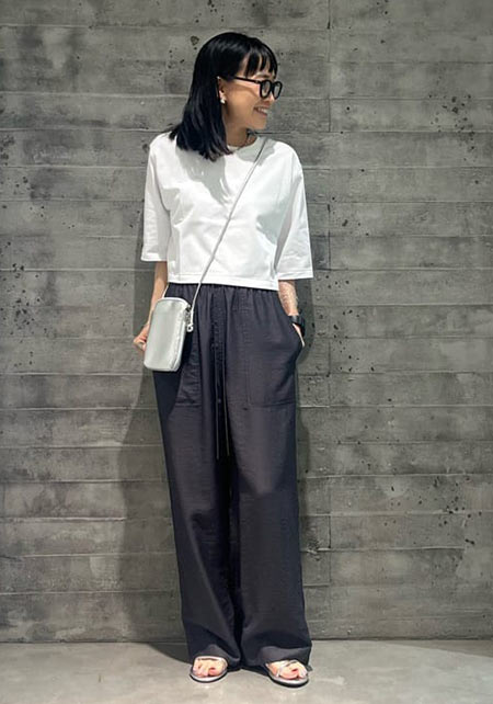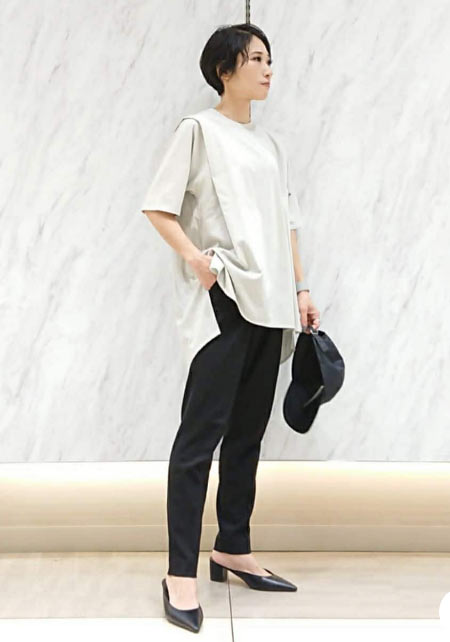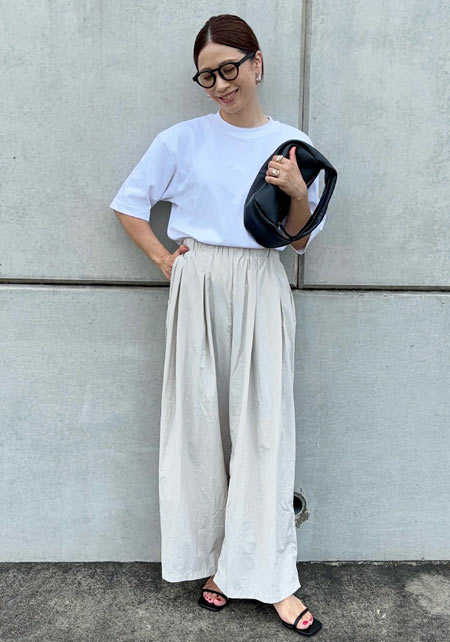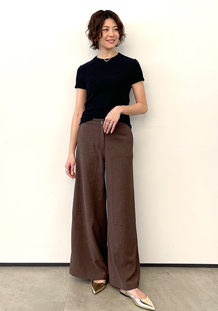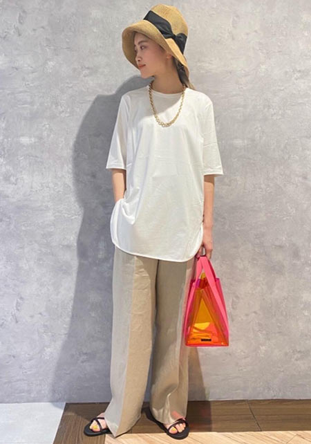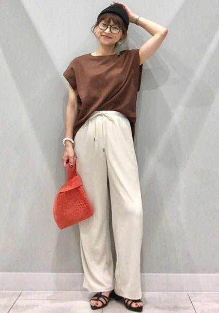 ママデザイナーが手がけるブランド『パリンカ』は、袖フリルなどの大人可愛いデザインが魅力。華やかで女らしさのあるTシャツが都会的フェミニンスタイルへ導きます。