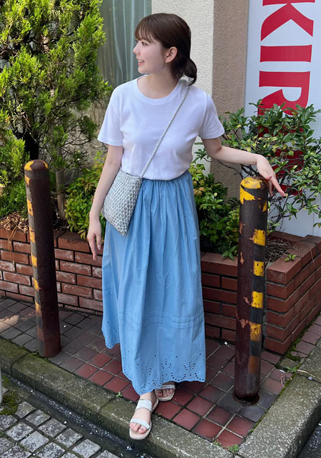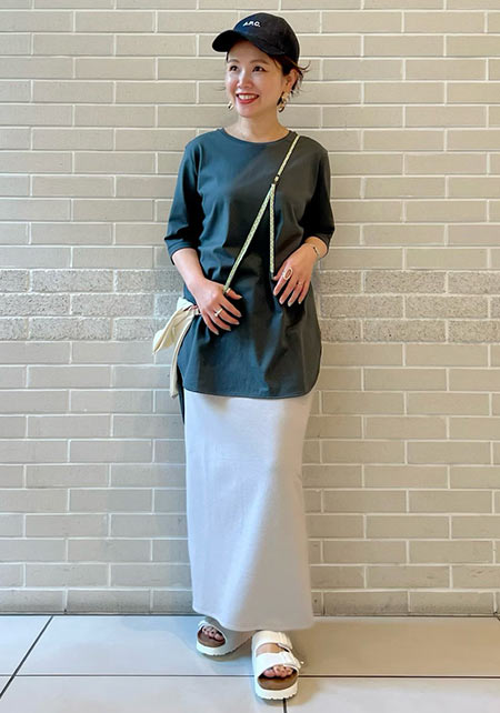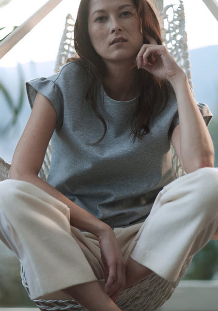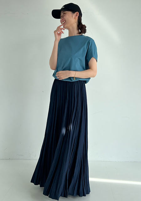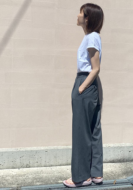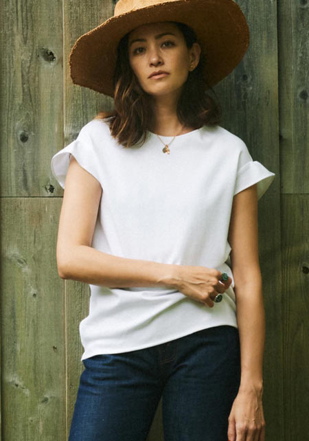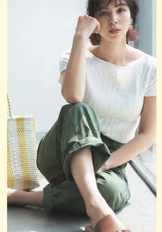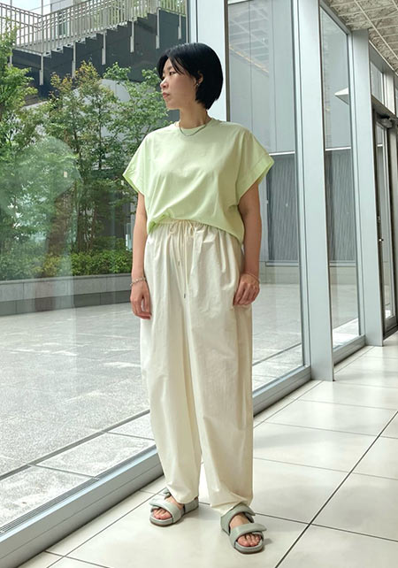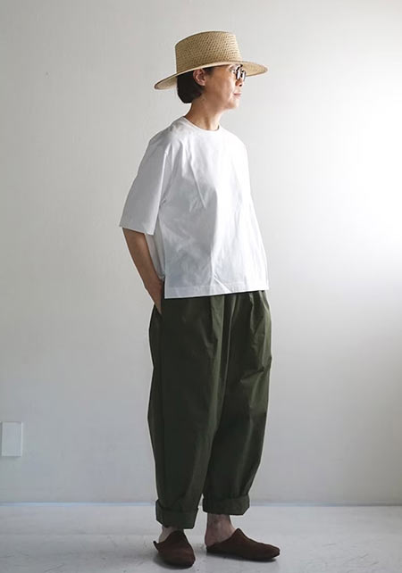 細くて長いコットン繊維で毛羽立ちがなく、柔らかく、薬品では出ない自然なツヤが上品。T型にしない袖の付け方で、肩幅を華奢に見せて女らしいTシャツスタイルに。