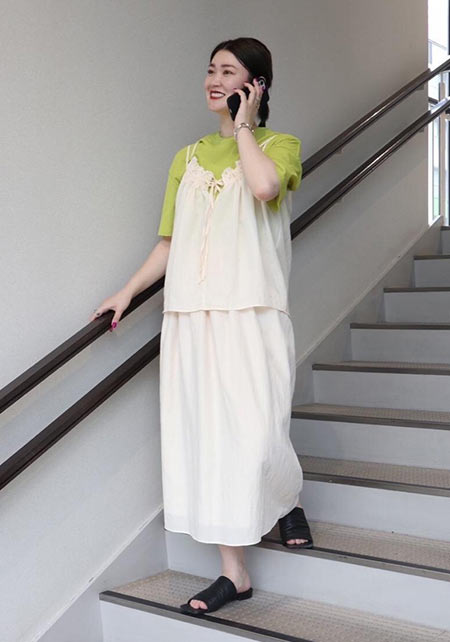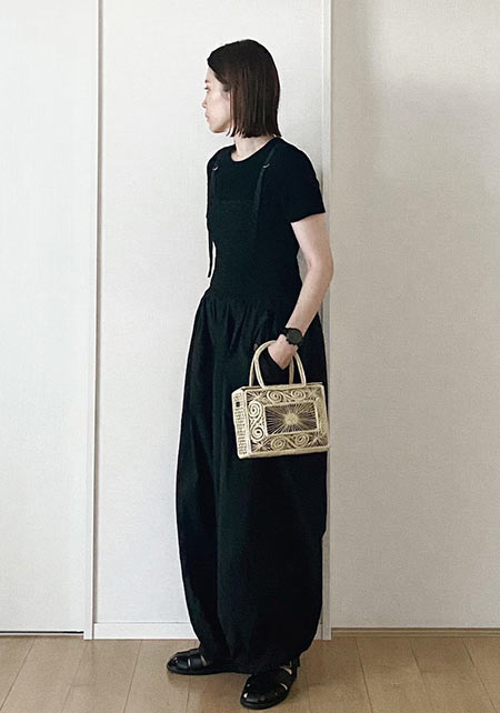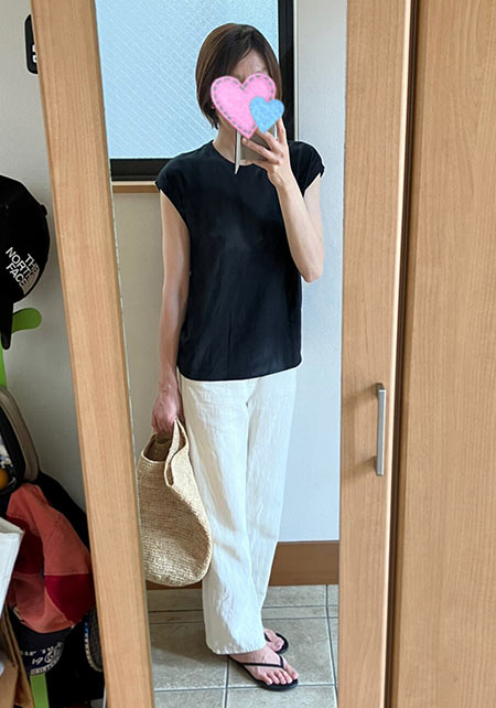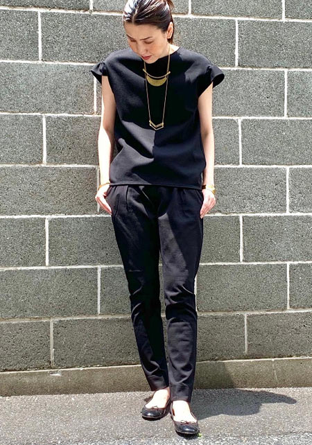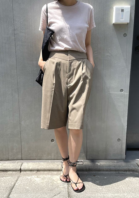 袖丈は二の腕半分で、シルエットも細身。肩がコンパクトに見えます。