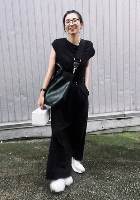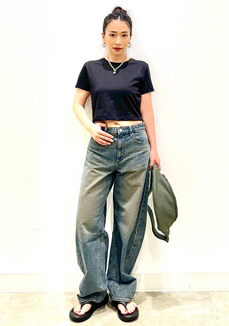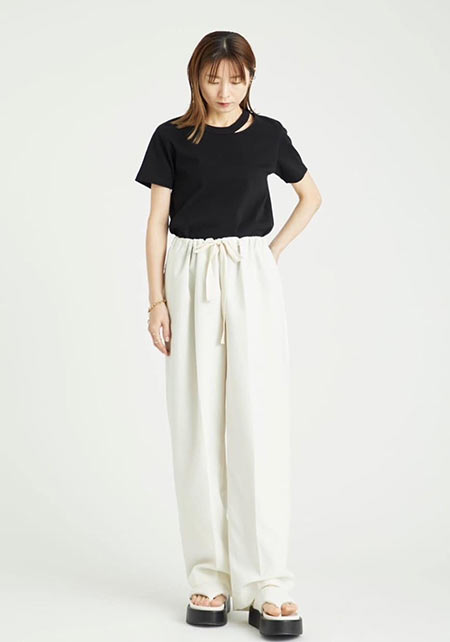 短めに設定された着丈が今っぽい。ドローストリングを絞ればフェミニンに、伸ばせば普通のTシャツとして使えると言うのも嬉しい。