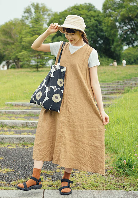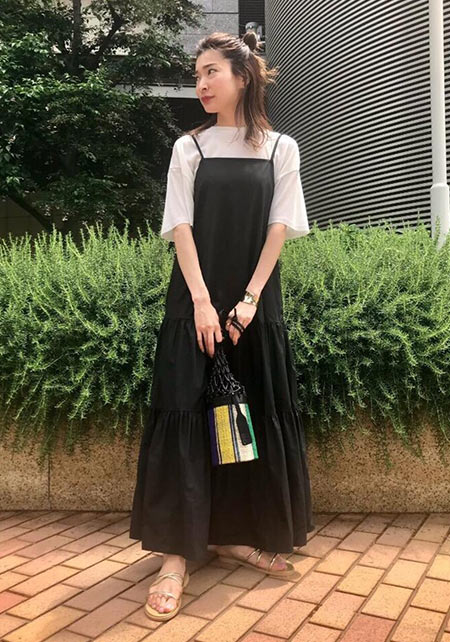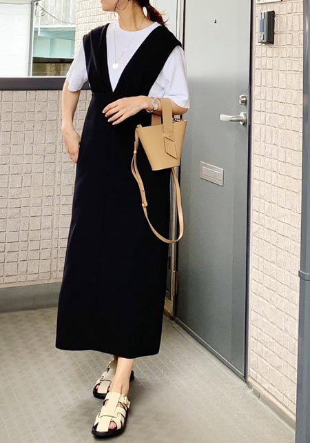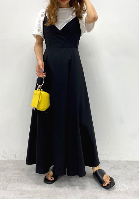 首まわりをほっそりと見せるように計算された、広すぎず狭すぎない開きが人気の秘密。透け感のあるマテリアルは、真夏に最適な涼しげな印象をプラスします。