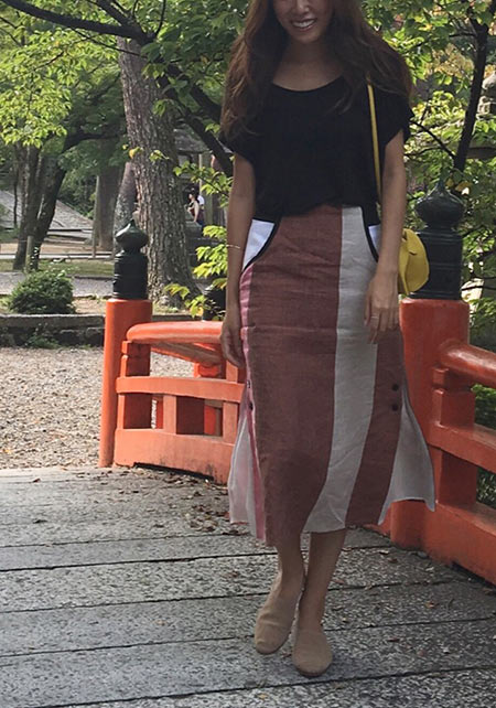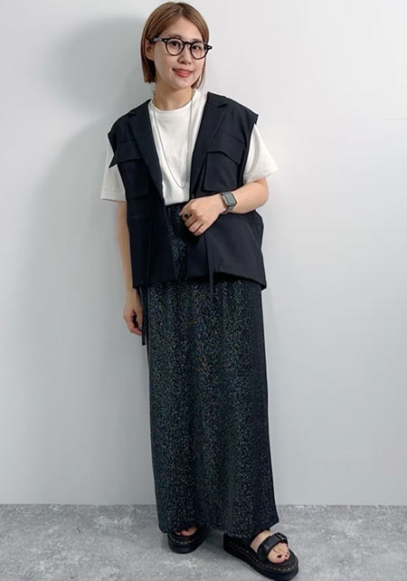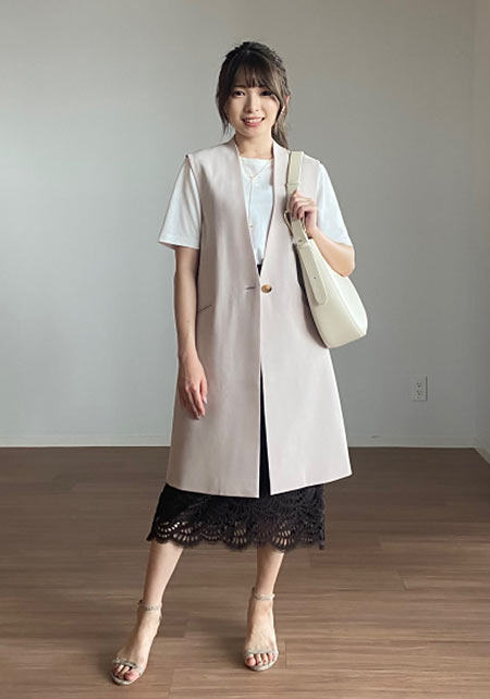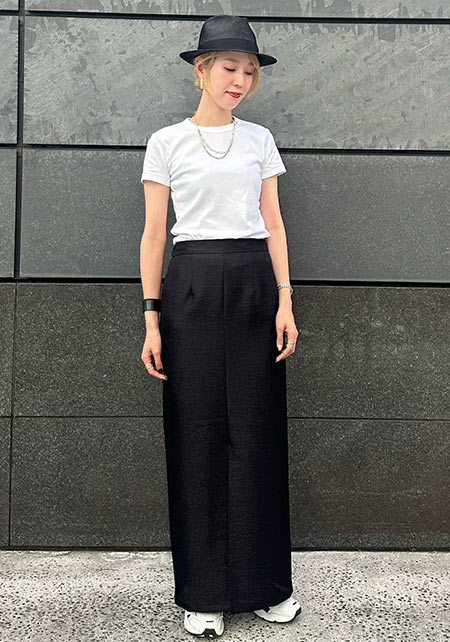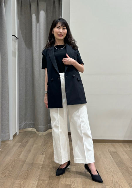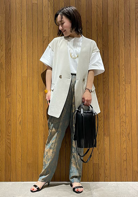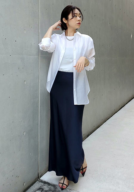 男性デザイナーらしいベーシックなシルエットを、柔らかな素材で女性らしく表現。サイドスリット入りで後ろがやや長めで、アウトしても着られる。