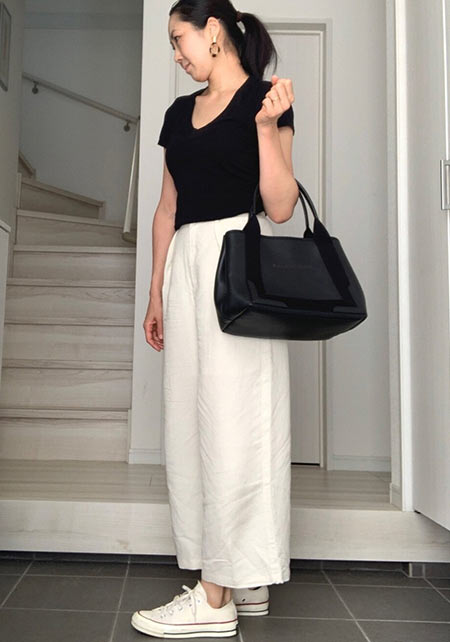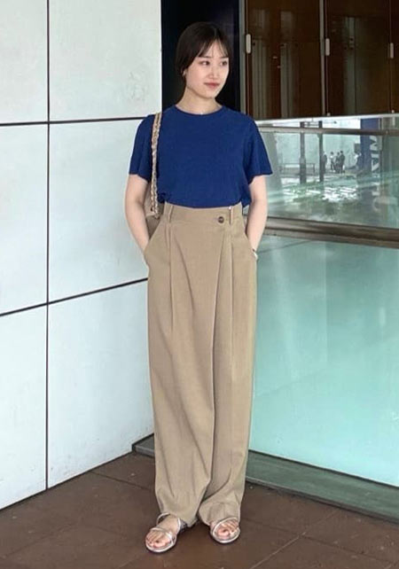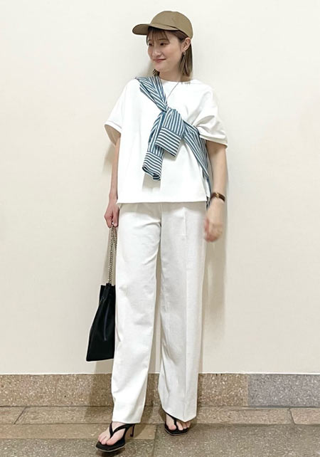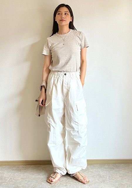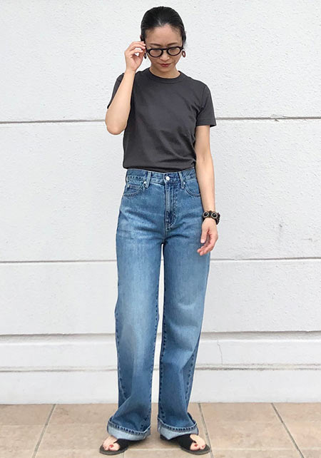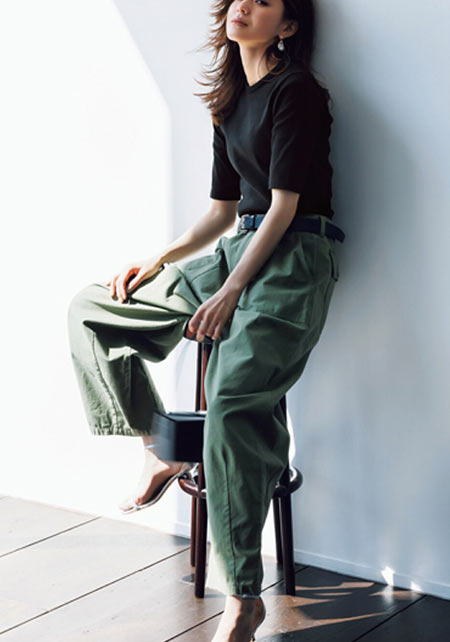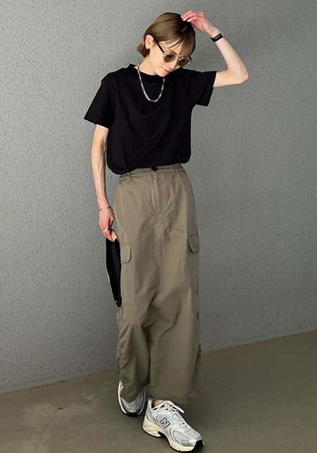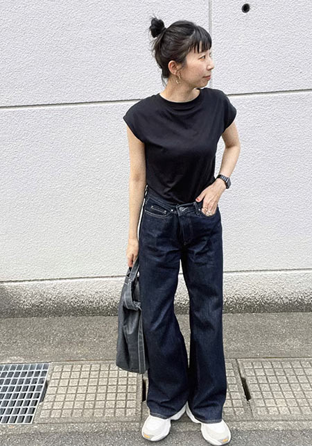 毎年進化して登場するユニクロのTシャツで注目したいのが、いい感じのゆるさが出るボートネック。通勤ボトムスにはもちろん、デニムやカーゴパンツに女らしさをプラスしてくれます。