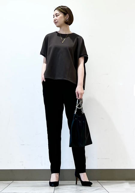 襟元のサテンパイピングやツヤのある生地のおかげで 、カジュアルすぎない印象に。横幅のあるクルーネックとゆとりのあるつくりで華奢見えも叶います。