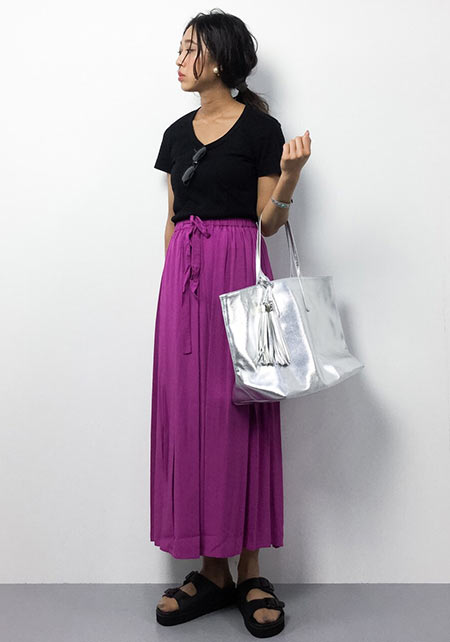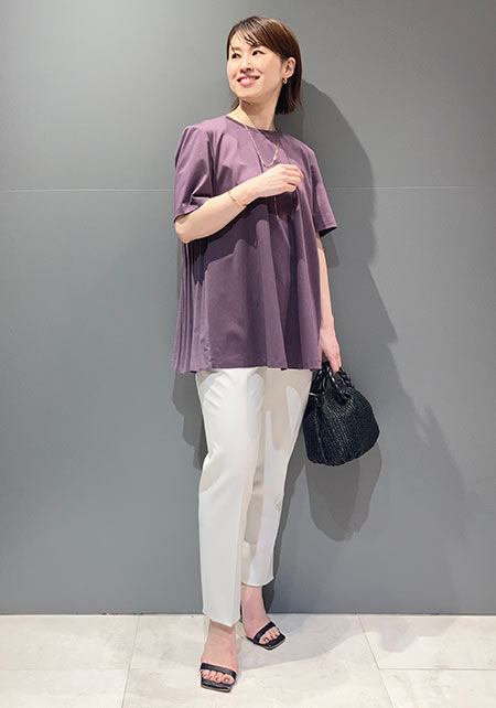 派手可愛いシルエットの袖に技ありのプリーツフリルTシャツ。大人には甘いレディなデザインも、同色ならチャレンジしやすいです。