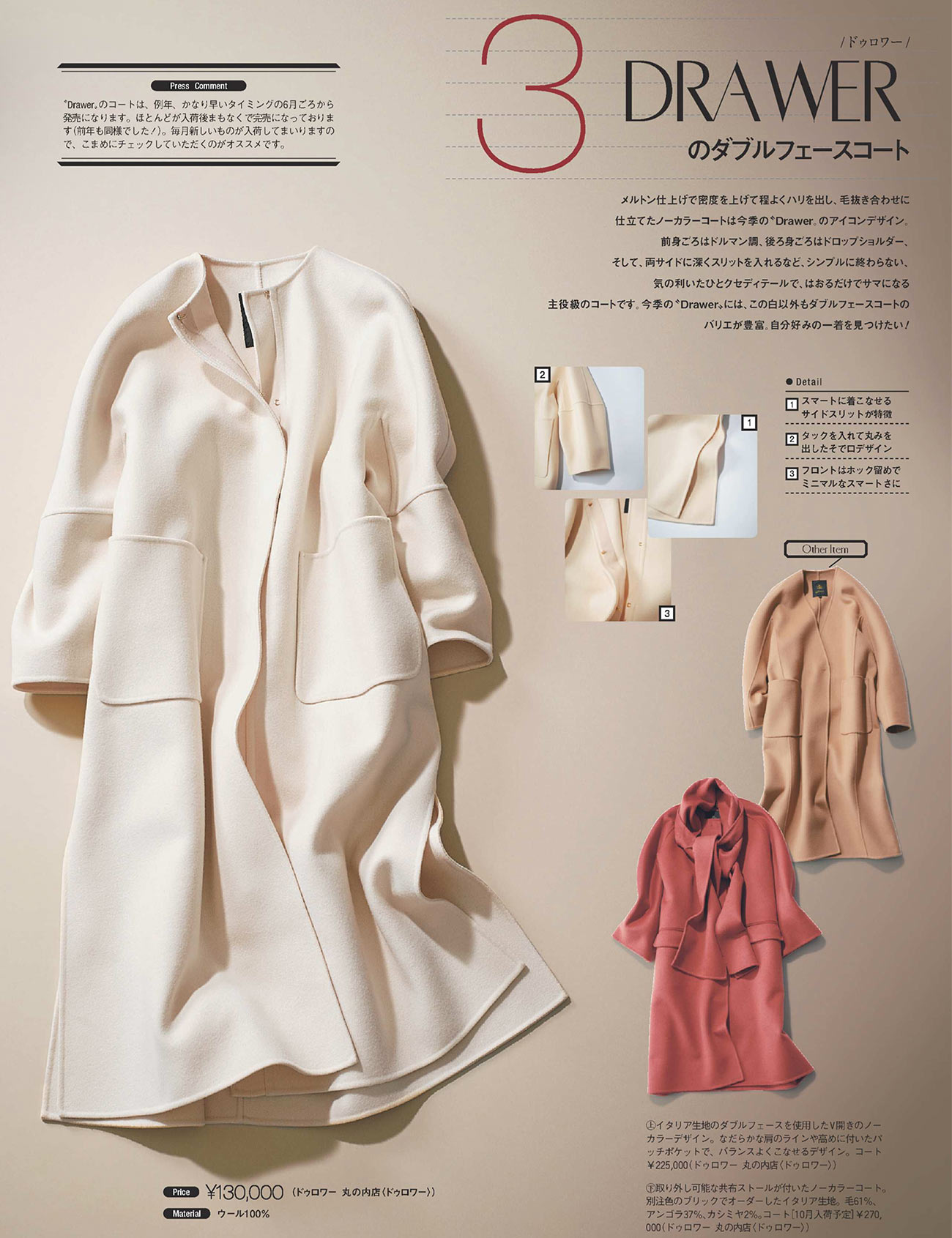 上品な女性らしさを引き立たせる「ボトルネック」のコート。柔らかなホワイトカラーが華やかな雰囲気を出します。