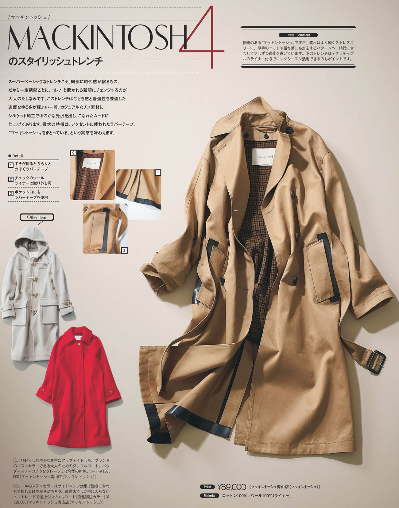 顔周りに華やかさを添えるラクーンファーをあしらった定番トレンチコート。きれいなシルエットと撥水性もポイント。ファーは取り外し可能で2通りのスタイルが楽しめます。