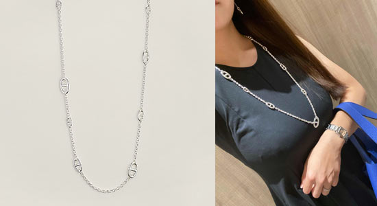 錨(いかり)の鎖をモチーフにしたコマが連なる、エルメスらしい逸品です。特に小ぶりなネックレスでは物足りなくなりがちな40代こそハマります。