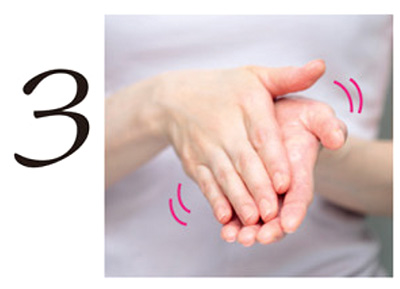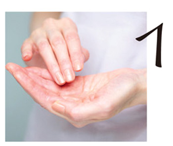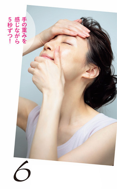 顔を上げ、両手のひら全体を肌にぴったりと密着させて、深呼吸をしながらしっかり浸透させる。あごと額、両側のほおの順に行う。
