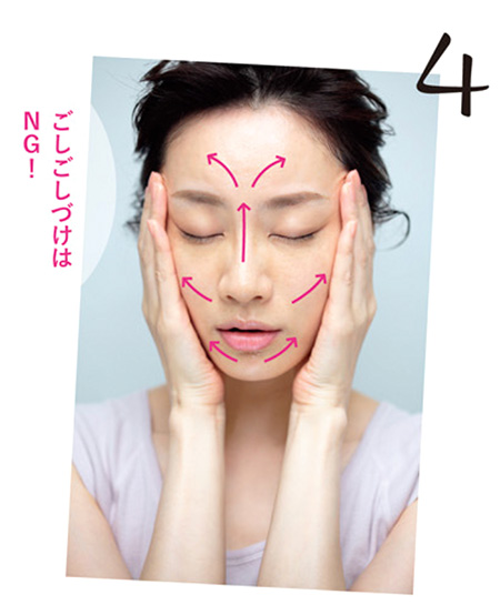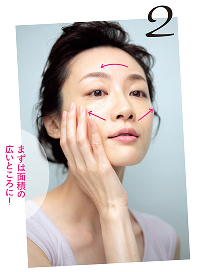 手のひら全体を肌にぴったりと密着させながら、顔の中心から外側へ向けて、顔全体にゆっくりとすべらせる。