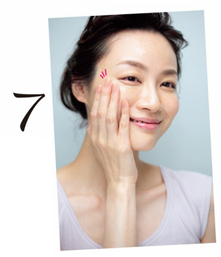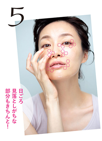 手に残った化粧水を、目もとや鼻まわり、口もとなどのパーツのくぼみに、指の腹でトントンとなじませる。
