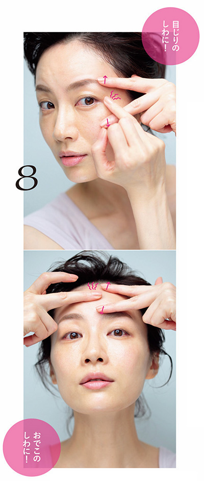美容液を少量、指の腹にとる。反対側の指でチョキをつくり、気になるしわをかるくのばして、美容液がついた指の腹を3秒ほど当ててじんわりと浸透させる。クリームも同様に1~8の手順で行う。