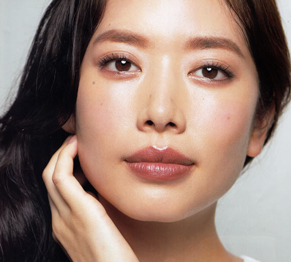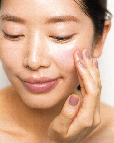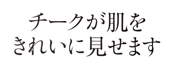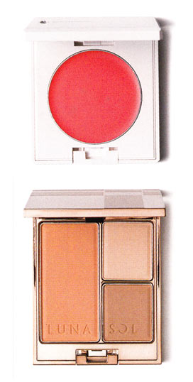 チークは、血色感をプラスして顔色をよく見せるだけでなく、肌の透明感も引き出し、きれいに見せる効果もあります。肌色を選ばない色は、コーラルやコーラルレッド。パウダーチーク(上の写真)は、小鼻の横から頬骨にそってこめかみにふわっと塗ります。