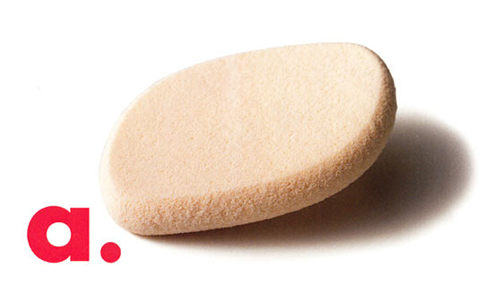 〈左〉ソフトな肌当りや形、弾力にこだわった、クリームチーク用のスポンジ。