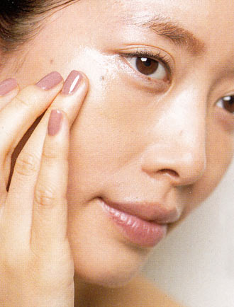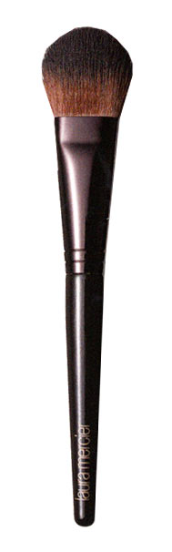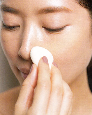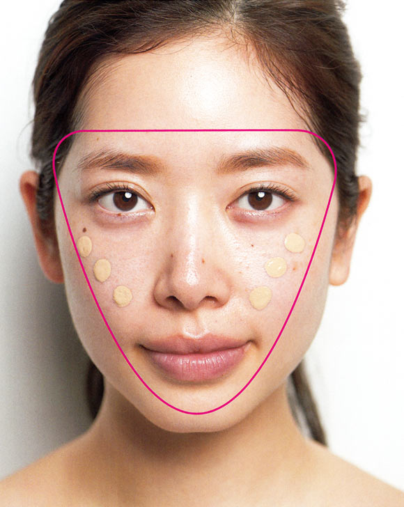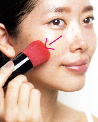 ファンデーション(リキッド、クリーム、クッションタイプ)は、塗っていないような自然な仕上りにするために、顔の中心部にだけブラシで塗ります。左右の頬3か所に薬指でぽんぽんと置きます(クッションタイプは中指をスポンジ面に当て、頬につけます)。