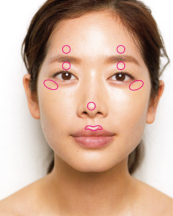 40代の肌に、生き生きとした立体感を生むのは艶。眉の上、まぶたの中央、?骨の上、鼻のトップ、上唇の中央の上にジェルタイプのハイライトをブラシで塗ります。広範囲に塗ると皮脂が浮いて見えるので注意!
