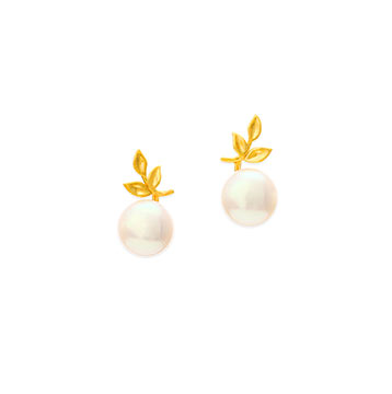 大ぶりのボタンパールにナチュラルなラインの小振りな葉を添わせたピアス。