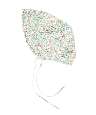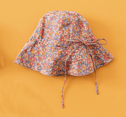 甘い匂いの花束が香る牧草地をイメージした、リバティプリント生地「Meadow Sweet(メドウ・スウィート)」の帽子。まるみのあるシルエットがかわいらしく、同柄のワンピースやブルマとのコーディネートもおすすめ