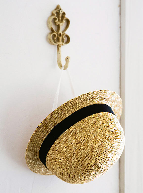 愛知県蟹江町の工房で、職人が1点ずつ手作りしているむぎわら帽子。ナチュラルカラーに黒のリボン、手刺繍とレースを施したモチーフがかわいい