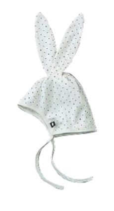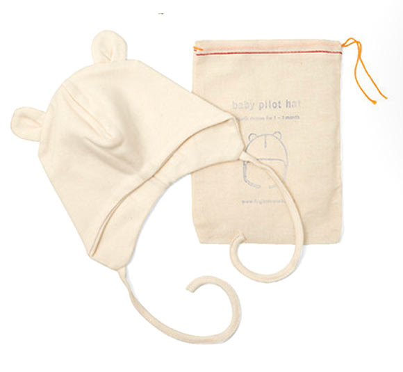 オーガニックコットン100%のベビーパイロットハット。立体的なシルエットに小さな耳が付いていてアクセントになっている。リネンの袋がセットになっているので贈り物にする人も多い。(1~3カ月)