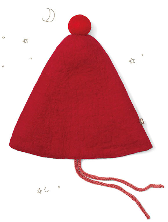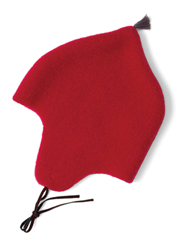 帽子にはあまり使われないフリース素材を使ったボンネット。サイドのひもはあご下で結んでも結ばずに垂らしてもいい。ウールフリース。レッド。6~12カ月用のSから4~5歳用のXLまで。