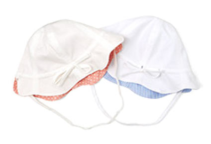 紫外線を90%以上カットしてくれるリバーシブルの帽子。洗濯してもその効果は持続する。サイズ調整が可能で便利。ピンク×ホワイトドット、ブルー×ホワイトストライプ他多種あり。44~52cm