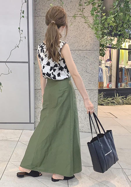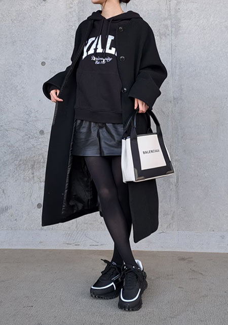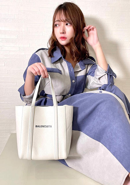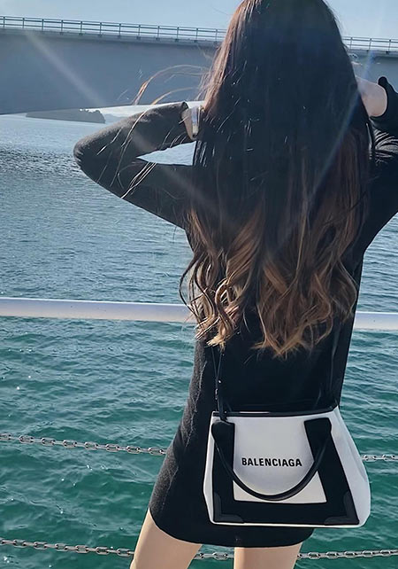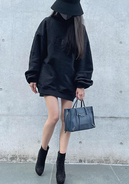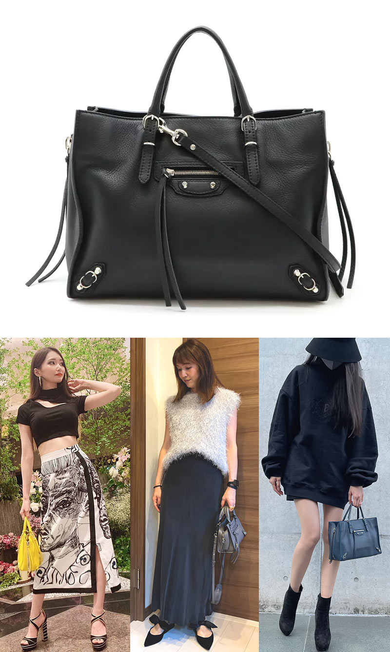 キャンバスとレザーを組み合わせた素材×フロントのBALENCIAGAロゴが特徴です。また、エルメスのケリーのような台形型が上品で、シンプルカジュアルながらラグジュアリー感を兼ね備えています。