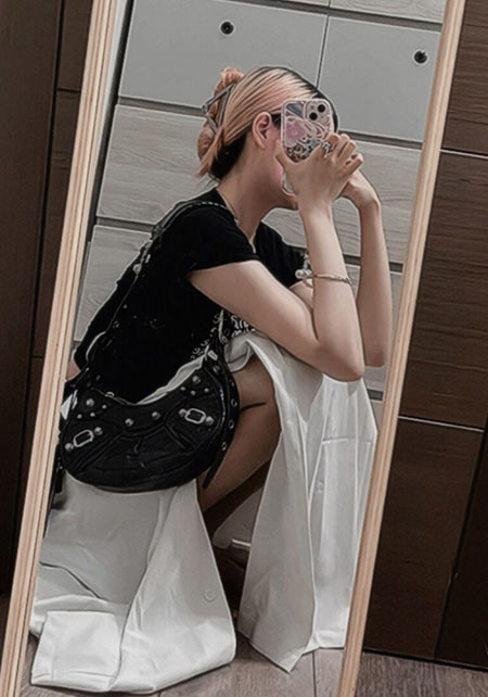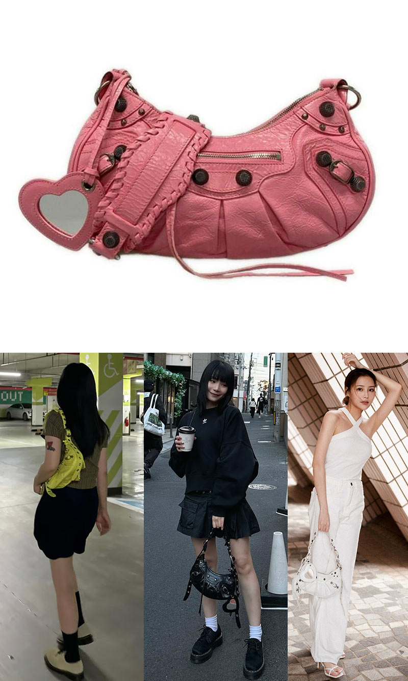 半月型のシルエットに、スタッズやバックル、ハート型ミラーなどY2Kなロックテイストと可愛さを融合。素材には主に柔らかなラムスキンが使われています。