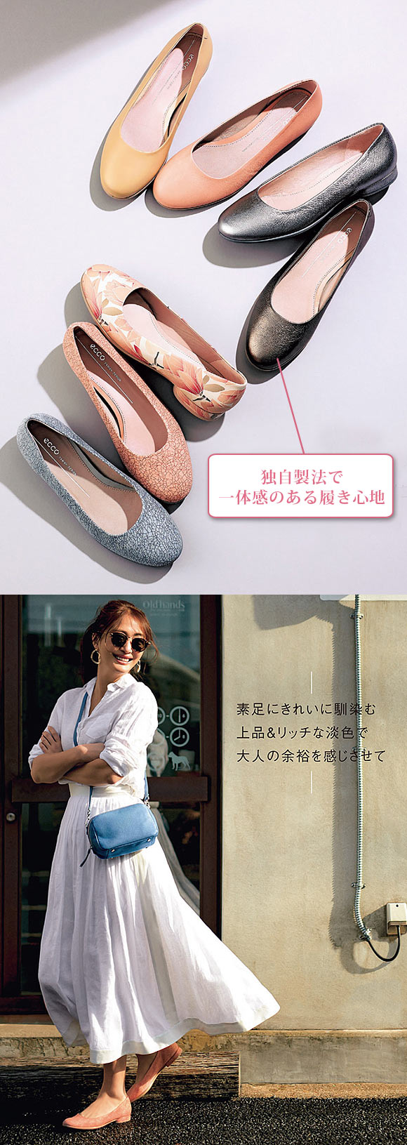 上品さを守りながら、オシャレ心も満たしてくれるバレリーナシューズ。長時間履いていても疲れにくい快適さも、愛される理由。