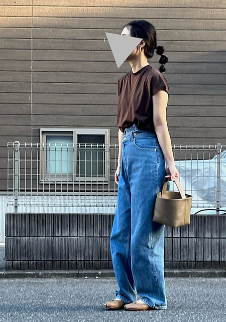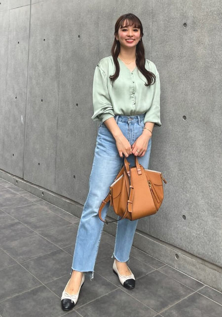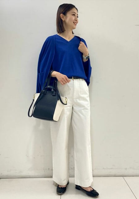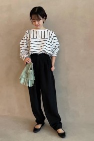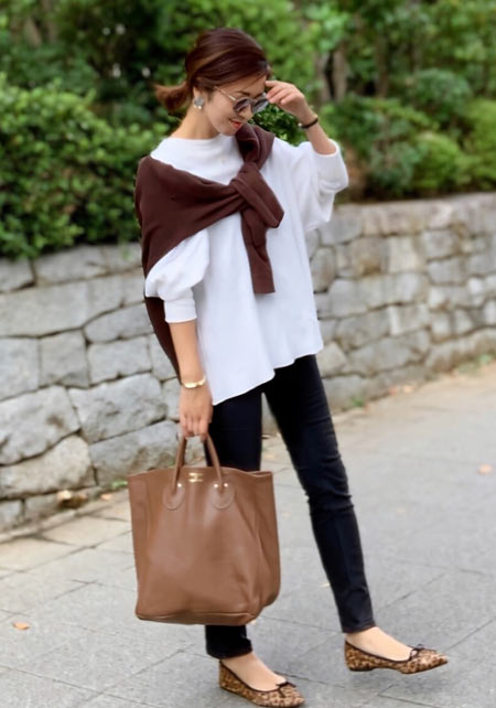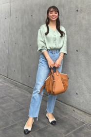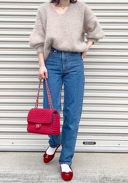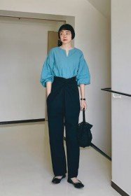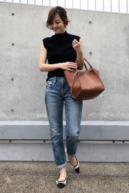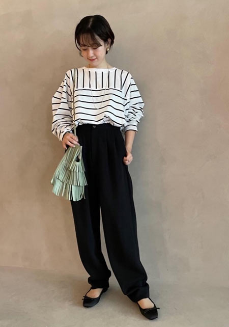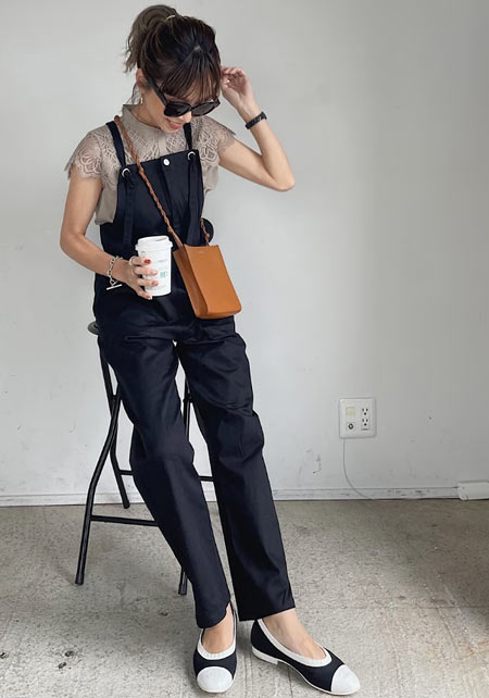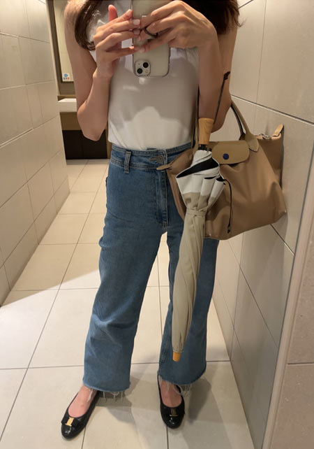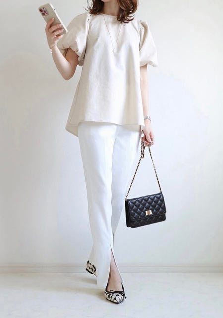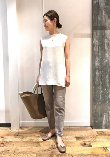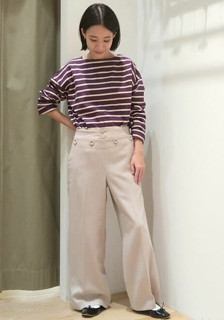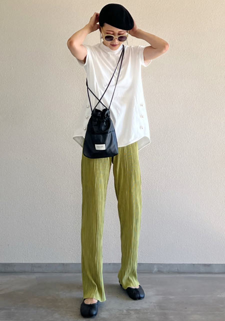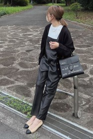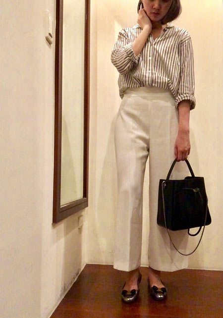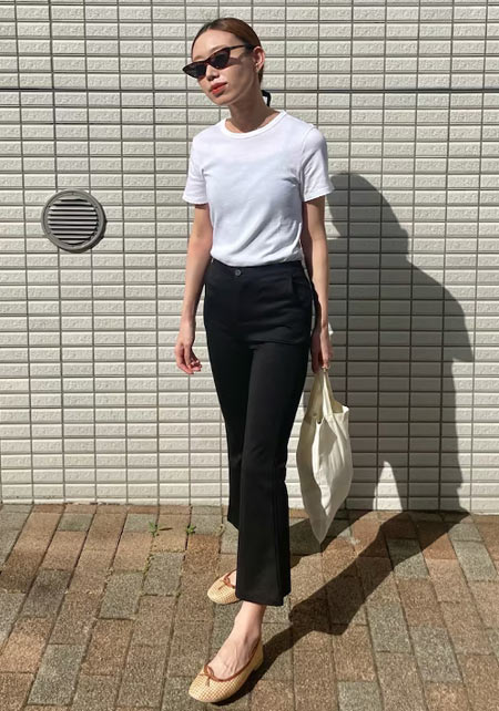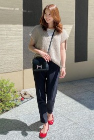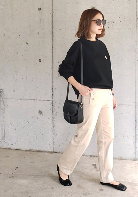 〈コーデ〉カジュアルなパンツスタイルもハイブランドのバレエで高級感を足せば、友人とのランチにも。