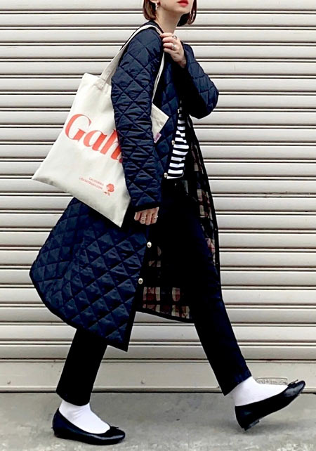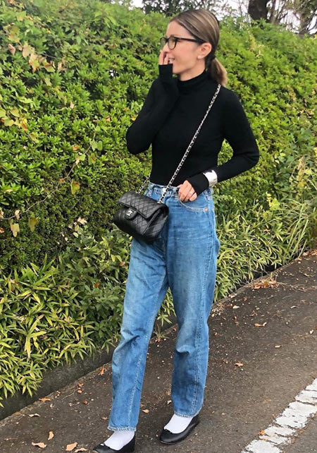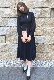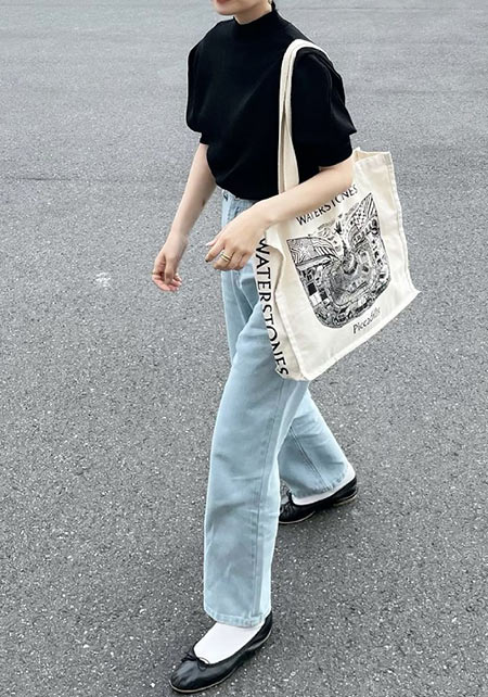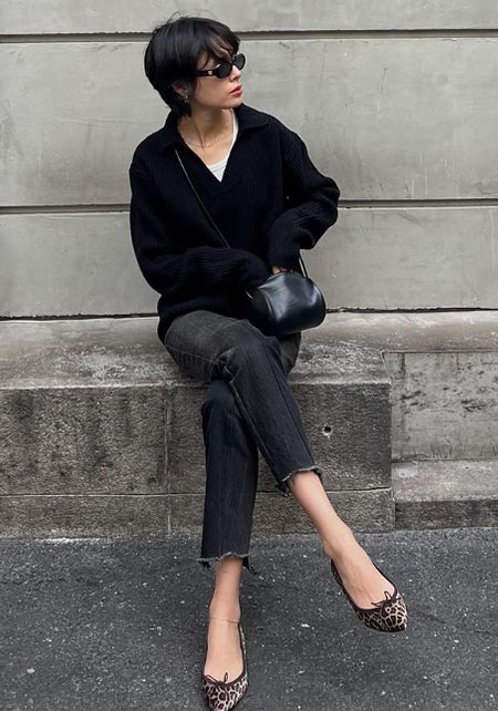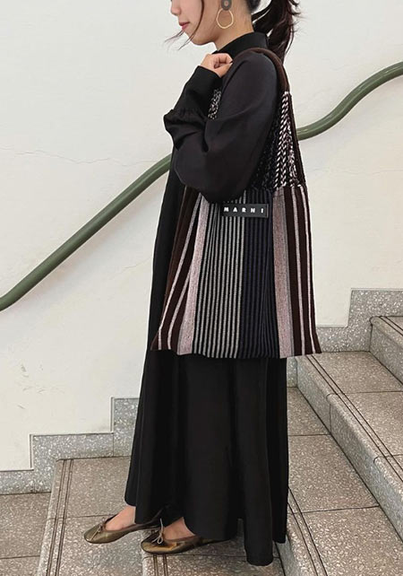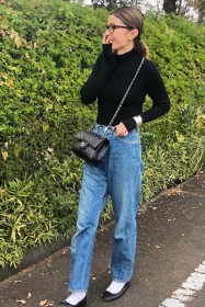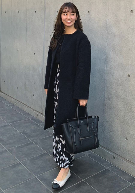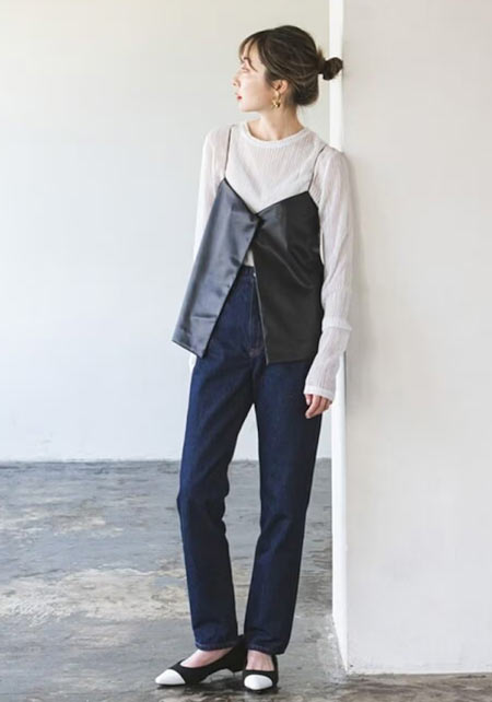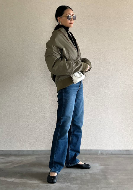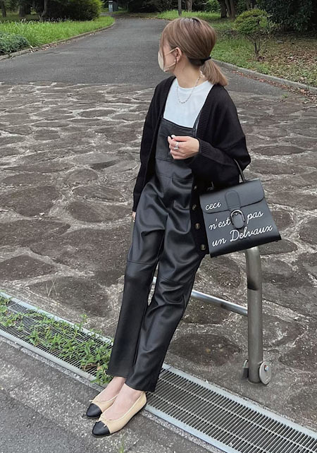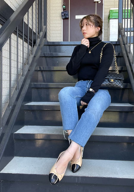 可愛らしいバレエシューズもブラック一色ならシックな印象に転ぶ。スタイリッシュな細身のボディが、コーデを引き締める鍵となる。