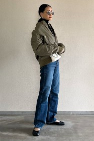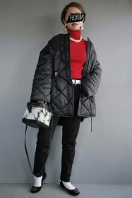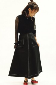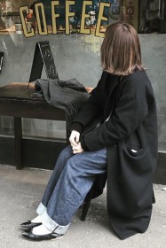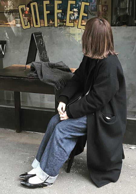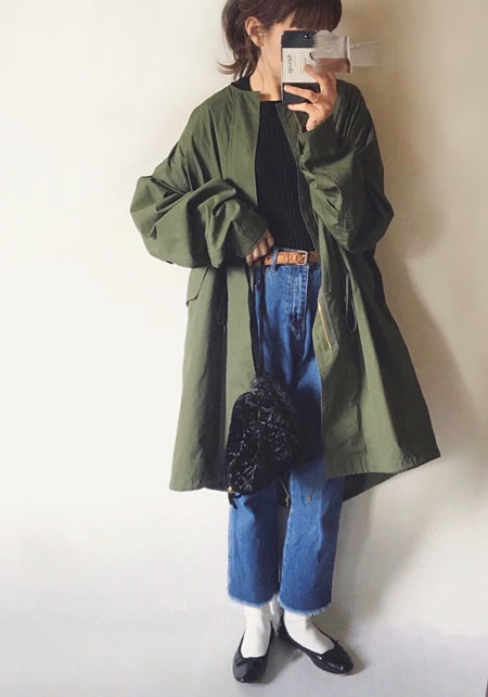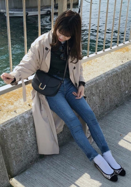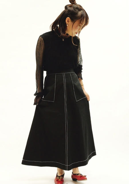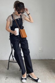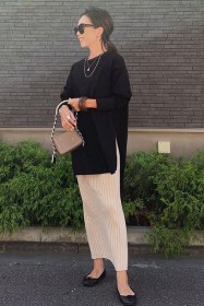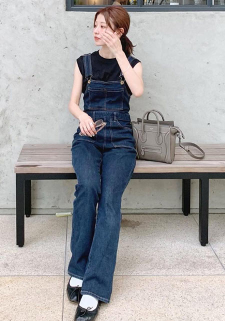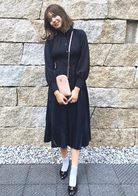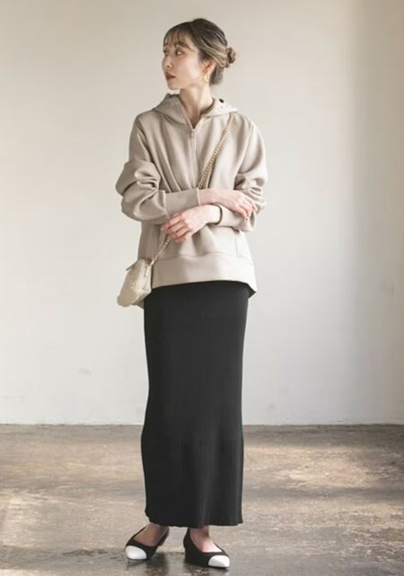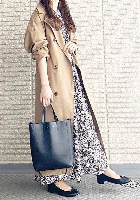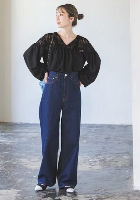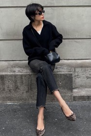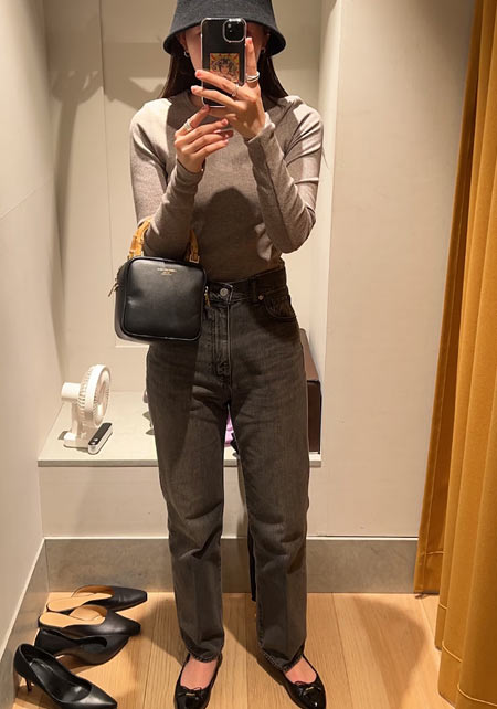 可愛らしいバレエシューズもブラック一色ならシックな印象に転ぶ。スタイリッシュな細身のボディが、コーデを引き締める鍵となる。