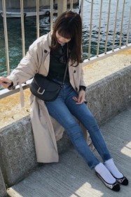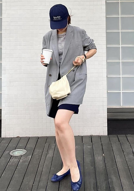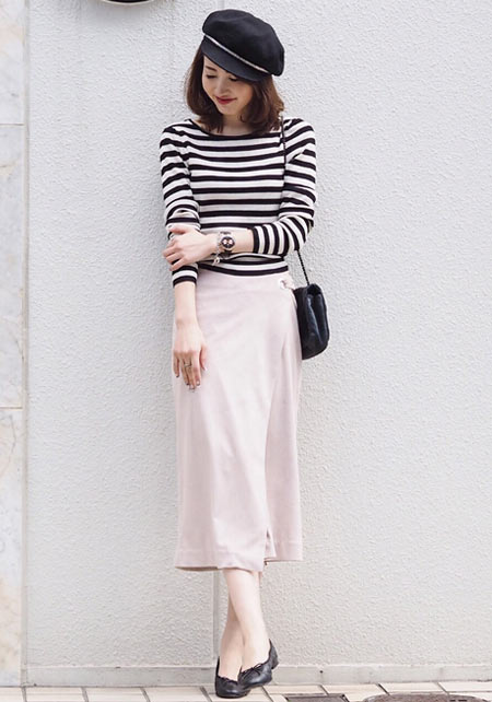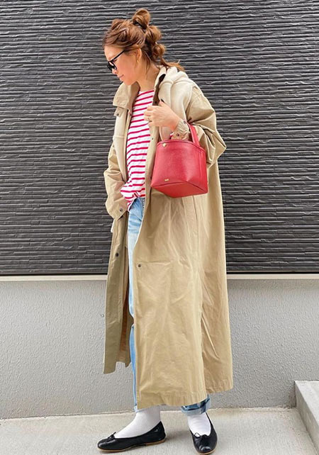 〈コーデ〉バレエシューズというとペッタンコで長く履いていると疲れてしまうのも多いけれど、この「アニネ」の薄い皮を表層に積み重ねた1.5cmのスタックヒールは軽量で柔軟性に優れているので長時間の快適な履き心地を約束してくれます。しかもアッパーと同じレザーでヒールをカバーすることで見た目の一体感も実現。