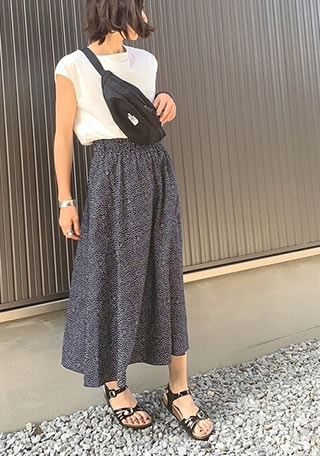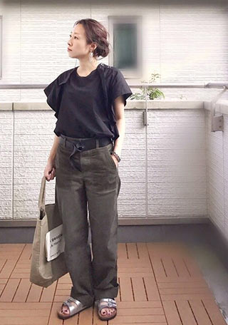 甲を覆うから重厚な印象のある「チューリッヒ」。そんな印象だから重ためなワイドパンツとは好相性。膝下から足元に重量感がでる分、対極的なノースリーブTシャツの華奢さが際立つ上級者コーデに。