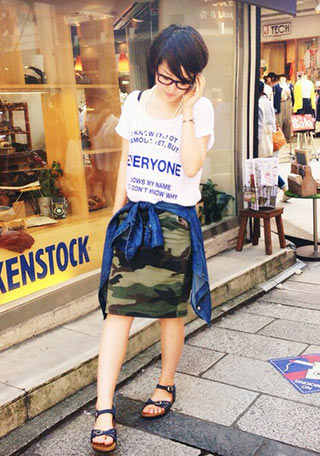 〈右〉対極な2ブランドのコラボが衝撃的で、Drawerでの販売を知り、発売日に並んで晴れて入手♪ gypsohilaのTシャツ×macahattのハーフパンツの楽ちんコーデでもこのサンダルがあればグッと印象が締まります。ボリュームがあるので、足元の露出もヘルシー。