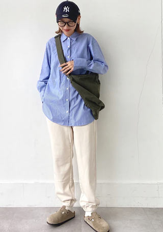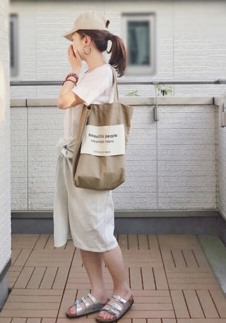 白シャツと「アリゾナ」の色をリンクした爽やかな夏コーデ。ミリタリーっぽいカーキパンツに白サンダルが中和的な役割。重たくなりすぎません。