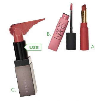 Aのピンク下地をブラシで塗ってトーンアップ。くすみを飛ばすと一気にアカ抜けた印象に。