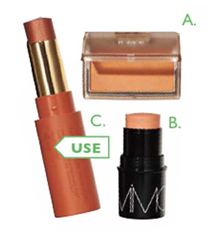 Cのチークをほほの少し内側にのせていく。程よくツヤがあるタイプならハイライト効果も。