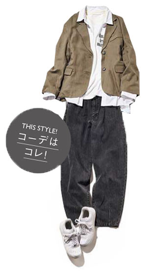 カーキ×ブラックの強めカラーを白で程よく中和して。秋っぽカラーでハンサムにキメ!