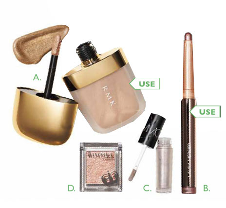 上まぶたにAのキラキラベージュのリキッドを。たっぷりのせて、指先で広めになじませよう。