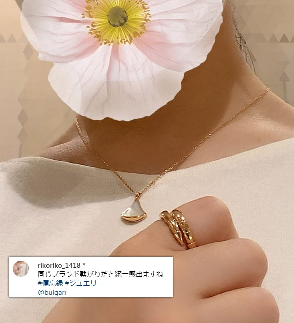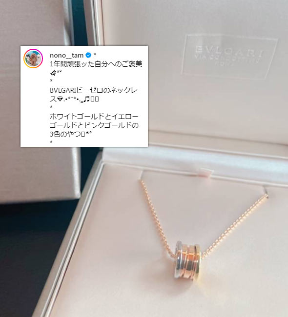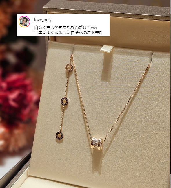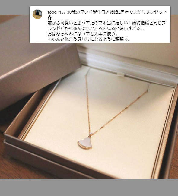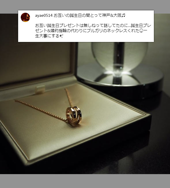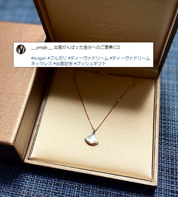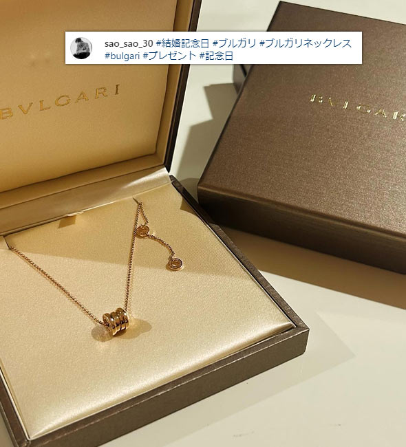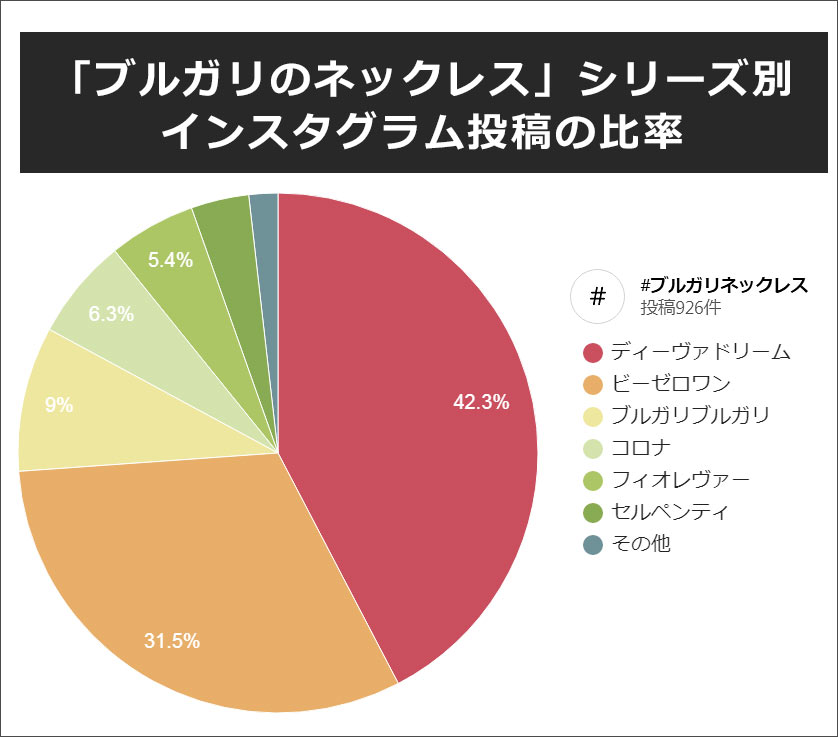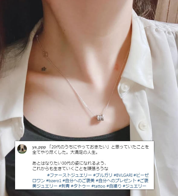 インスタグラムの「#ブルガリネックレス」926投稿の中から、女性がプレゼントされた投稿、自分へのご褒美で買った投稿、実際に着けている投稿、それらを集計し算出しました。