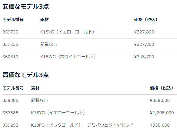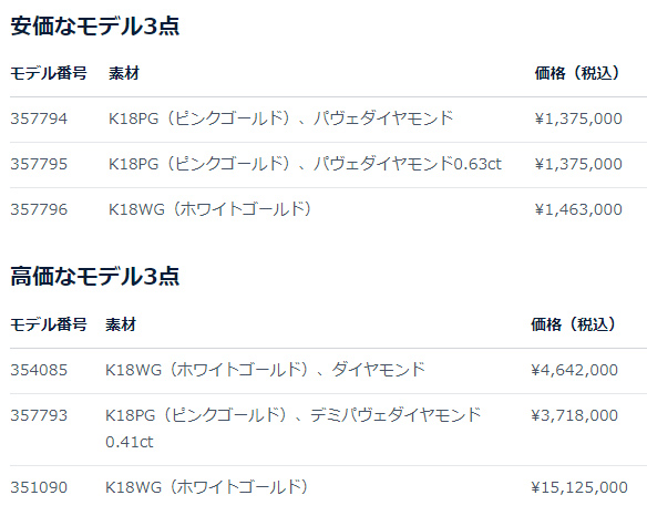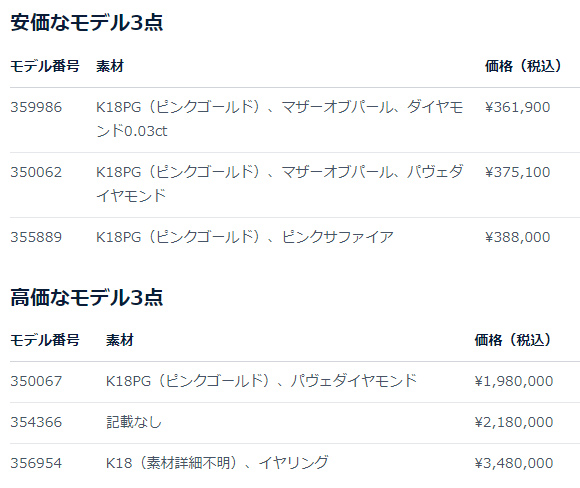 また、ハイジュエラーらしく18Kピンクゴールドやホワイトゴールドなどの高品質な素材を使っていて、一般的なブランドと一線を画しています。