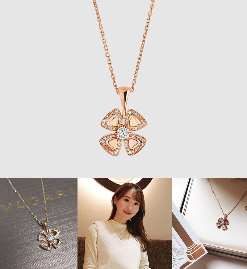 名前の通り、4枚の花びらを持つ花のデザインが特徴で、中央には最高級ダイヤモンドや宝石をセット。華やかな可憐さを持つ、唯一無二のネックレスです。