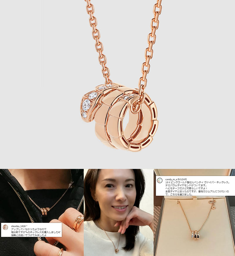 18Kピンクゴールド製セルペンティ ヴァイパーネックレス。デミパヴェダイヤモンドがついています。ヘビモチーフだけど可愛らしいですよ!