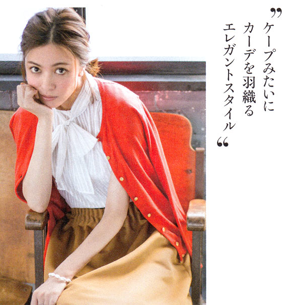 袖を通さずそのままカーデを羽織る着こなしは、エレガントで女らしいイメージ。