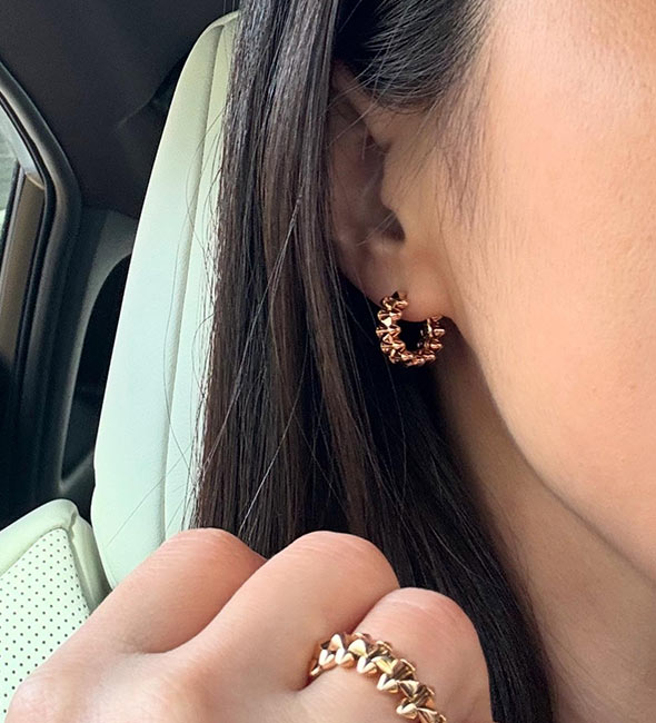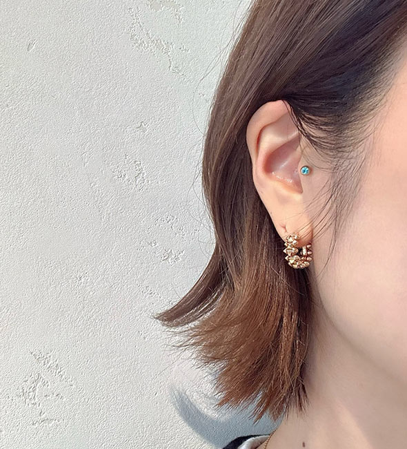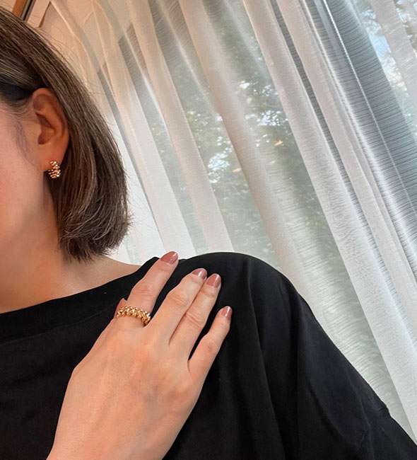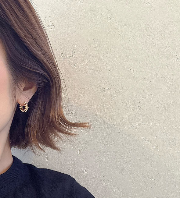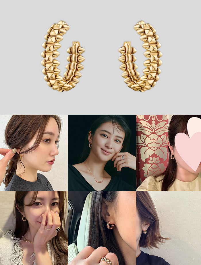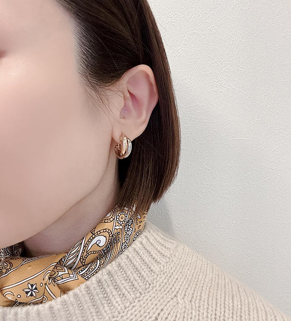 ピアスはそこまで人気が高くありませんでしたが、一目でカルティエと分かるアイコニックさは唯一無二。またヘリックス(耳軟骨部)ピアスとしても着用可能で、スタイリングの幅を広げます。
